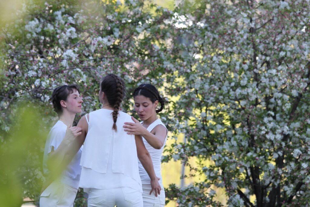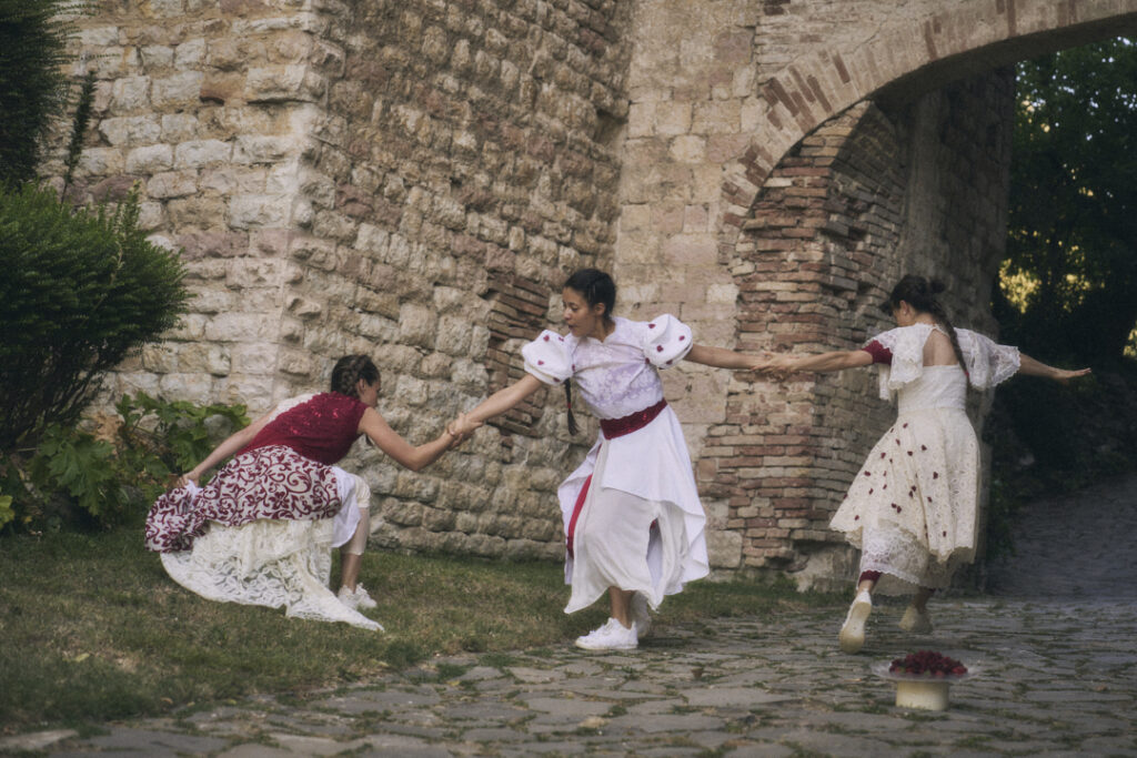 chiostri. Tre giovani donne appaiono sulla scena come figure sospese nel tempo, richiamando immagini di